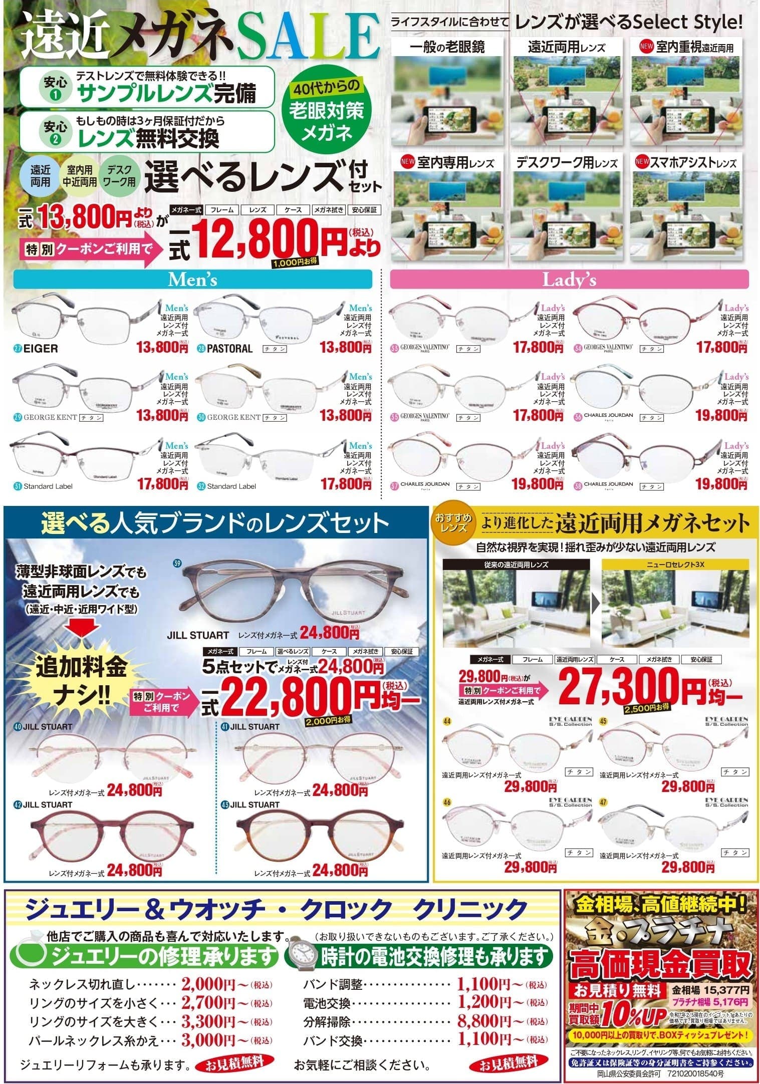 〇遠近両用レンズ付きメガネ一式29,800円(税込) → 特別クーポンご利用で 27,300円均一(税込) 2,500 OFF!!